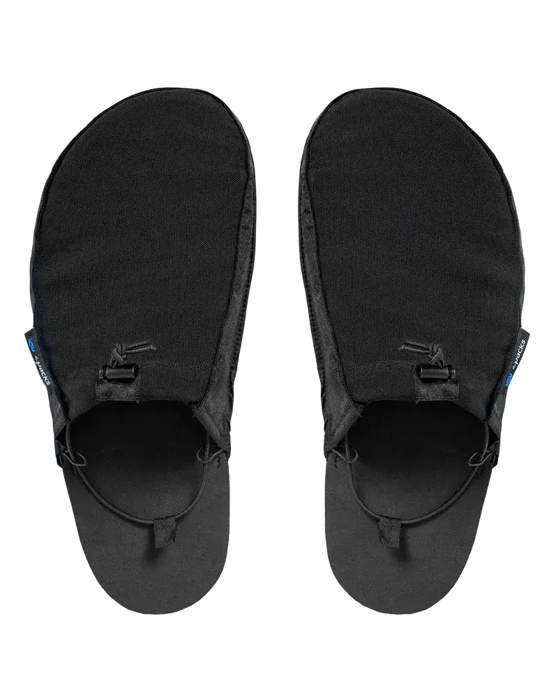 Gemaakt van duurzame Robic stof met ademend lycra gaas (niet waterdicht… dus pas op nat gras en verse droge sokken) en een 4 mm schuimrubberen zool. Sterk genoeg voor ondergrond rondom het kamp, licht genoeg om er geen seconde aan te twijfelen om ze mee te nemen.